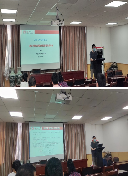 2023年6月10日上午,福州大学邹剑副教授应邀为皇冠集团网站密码分析团队师生于数统皇冠集团网站201报告厅作了题为《基于周期性质的新型密钥恢复攻击方法》的学术报告。
