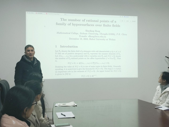 2023年12月18日上午,四川大学洪绍方教授应邀为皇冠集团网站师生作了题为《The number of rational points of a family of hypersurfaces over finite fields》的学术报告。