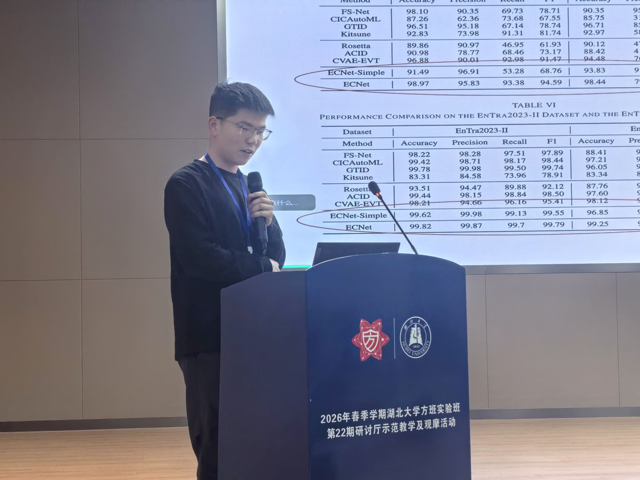 皇冠集团网站研究生尹梓帆、骆燕、熊劲乔、易智豪4名学员依次围绕知识图谱、加密流量识别、人工智能安全、恶意流量检测等网安前沿课题作学术报告。专家们从选题价值、逻辑结构、论证深度、创新点提炼等维度进行精准点评与系统指导,引导学员深挖研究本质、提升思辨能力。现场互动热烈,充分展现了方班“以讲促学、以问启思、以评提质”的鲜明特色。