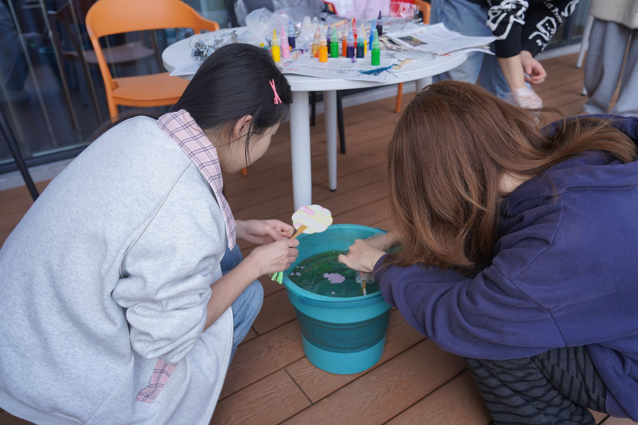 活动现场,皇冠集团网站精心布置的阳台焕然一新。新栽种的绣球花与郁金香竞相绽放,粉紫相间、春意盎然。同学们围坐在花丛间的桌椅旁,在轻松愉悦的氛围中开始了漆扇创作。大家手持素白扇面,蘸取各色颜料,或描绘心中美景,或书写青春寄语,将所思所感倾注于笔端。活动现场欢声笑语不断,同学们在艺术创作中放松身心,在交流互动中增进情谊。